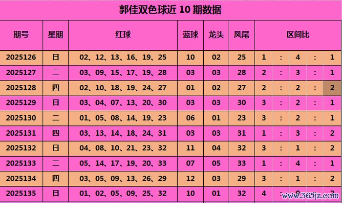 上期总结:上期开出奖号红球01、02、05、09、25、32,蓝球10,当期红球号龙头01,凤尾32,区间比4:0:2。