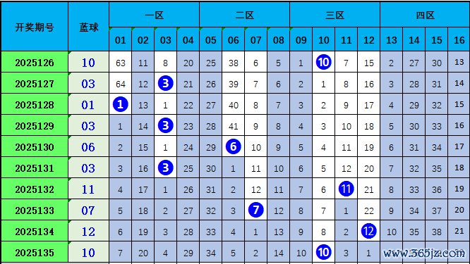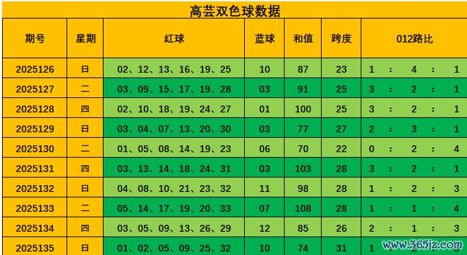 上期转头红球开出01,02,05,09,25,32,蓝球开出10,和值74,跨度31。012路比1:2:3。